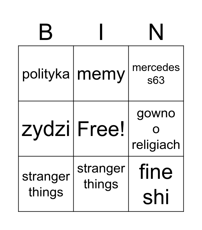 This bingo card has a free space and 9 words: stranger things, mercedes s63, memy, zydzi, polityka, gowno o religiach, fine shi, bmw and stranger things.