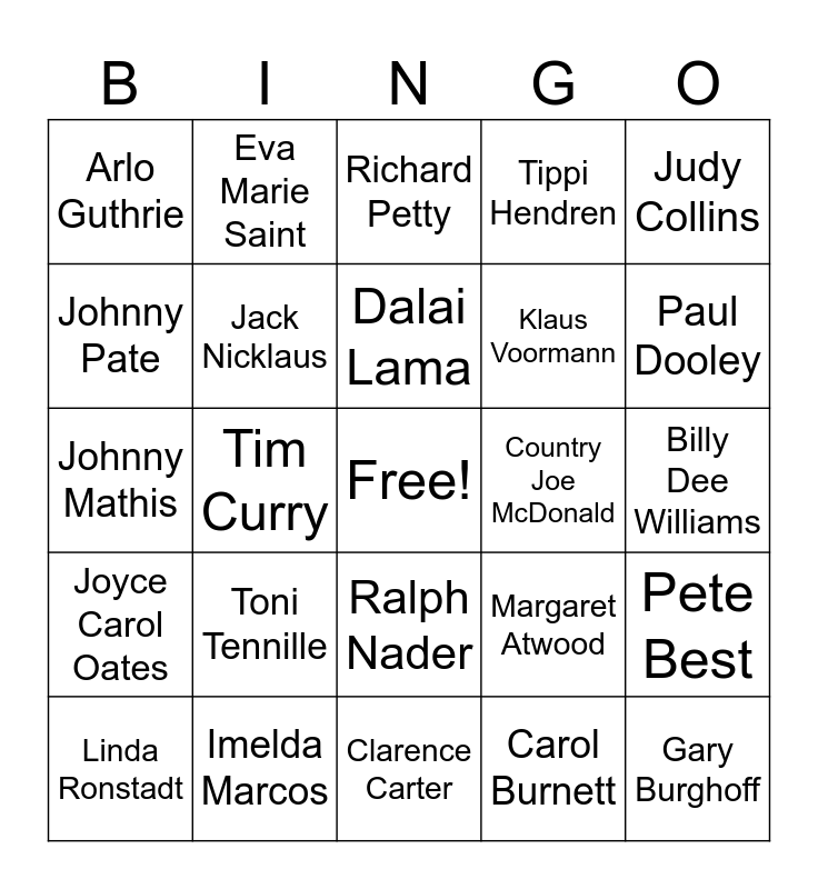 This bingo card has a free space and 24 words: Toni Tennille, Imelda Marcos, Dalai Lama, Linda Ronstadt, Judy Collins, Arlo Guthrie, Johnny Pate, Eva Marie Saint, Country Joe McDonald, Ralph Nader, Klaus Voormann, Johnny Mathis, Margaret Atwood, Pete Best, Jack Nicklaus, Carol Burnett, Billy Dee Williams, Richard Petty, Paul Dooley, Tim Curry, Gary Burghoff, Joyce Carol Oates, Tippi Hendren and Clarence Carter.