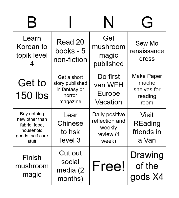 This bingo card has 17 words: Free!, Finish mushroom magic, Get mushroom magic published, Learn Korean to topik level 4, Lear Chinese to hsk level 3, Sew Mo renaissance dress, Visit REading friends in a Van, Do first van WFH Europe Vacation, Make Paper mache shelves for reading room, Get a short story published in fantasy or horror magazine, Cut out social media (2 months), Daily positive reflection and weekly review (1 week), Get to 150 lbs, Read 20 books - 5 non-fiction, Buy nothing new other than fabric, food, household goods, self care stuff, Make an indoor herb garden and Drawing of the gods X4.
