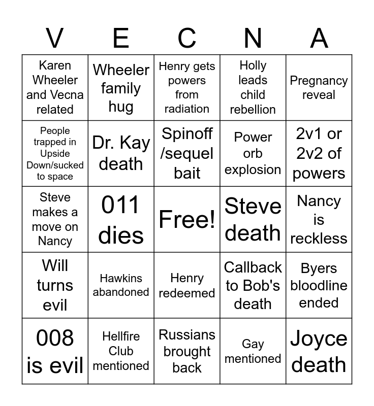 This bingo card has a free space and 29 words: 008 is evil, "Stranger things" phrase used, 011 dies, Derek curses out Vecna, Karen Wheeler and Vecna related, Henry gets powers from radiation, Dr. Kay death, Hawkins abandoned, Steve death, Hellfire Club mentioned, Nancy is reckless, Joyce death, Russians brought back, Gay mentioned, 2v1 or 2v2 of powers, Robin death 🙏🏻, Henry redeemed, Will turns evil, Pregnancy reveal, Steve makes a move on Nancy, Callback to Bob's death, Demogorgon army, Power orb explosion, People trapped in Upside Down/sucked to space, Holly leads child rebellion, Wheeler family hug, Byers bloodline ended, Spinoff /sequel bait and Cliche 80s song/DJO End of Beginning needle drop.
