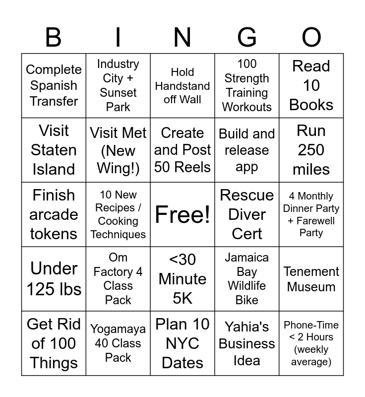 This bingo card has a free space and 24 words: Om Factory 4 Class Pack, Yogamaya 40 Class Pack, Create and Post 50 Reels, Get Rid of 100 Things, Read 10 Books, Complete Spanish Transfer, Visit Staten Island, Industry City + Sunset Park, Rescue Diver Cert, <30 Minute 5K, Build and release app, Finish arcade tokens, Jamaica Bay Wildlife Bike, Tenement Museum, Visit Met (New Wing!), Yahia's Business Idea, 4 Monthly Dinner Party + Farewell Party, Hold Handstand off Wall, Run 250 miles, 10 New Recipes / Cooking Techniques, Phone-Time < 2 Hours (weekly average), Under 125 lbs, 100 Strength Training Workouts and Plan 10 NYC Dates.