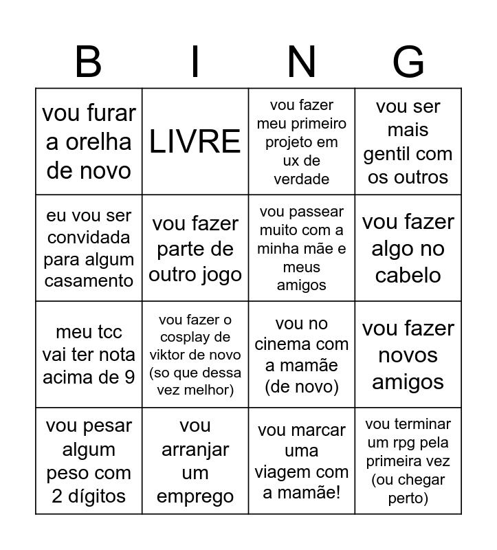 This bingo card has 16 words: vou arranjar um emprego, vou fazer novos amigos, vou fazer meu primeiro projeto em ux de verdade, vou furar a orelha de novo, meu tcc vai ter nota acima de 9, LIVRE, vou no cinema com a mamãe (de novo), vou marcar uma viagem com a mamãe!, eu vou ser convidada para algum casamento, vou fazer parte de outro jogo, vou pesar algum peso com 2 dígitos, vou ser mais gentil com os outros, vou fazer o cosplay de viktor de novo (so que dessa vez melhor), vou fazer algo no cabelo, vou passear muito com a minha mãe e meus amigos and vou terminar um rpg pela primeira vez (ou chegar perto).