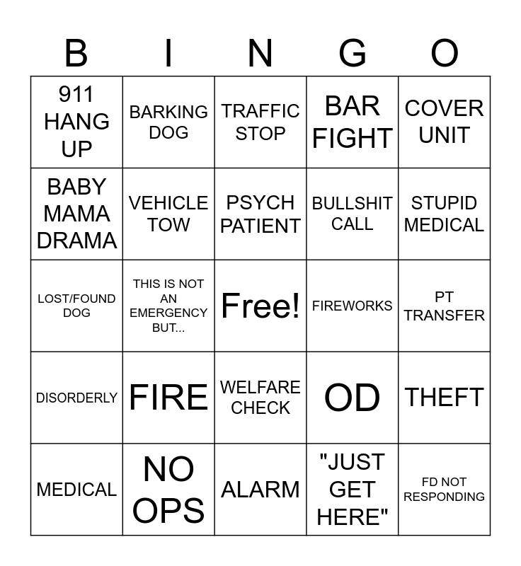 This bingo card has a free space and 29 words: MEDICAL, SHOTS FIRED, THIS IS NOT AN EMERGENCY BUT..., DUI, 911 HANG UP, TRAFFIC STOP, VEHICLE TOW, FIRE, FIREWORKS, NO OPS, PT TRANSFER, FD NOT RESPONDING, ALARM, "JUST GET HERE", STUPID MEDICAL, ASSAULT, WELFARE CHECK, DISORDERLY, COVER UNIT, LOST/FOUND DOG, OD, LIVESTOCK, BULLSHIT CALL, BABY MAMA DRAMA, BAR FIGHT, BARKING DOG, THEFT, PSYCH PATIENT and CIVIL!.