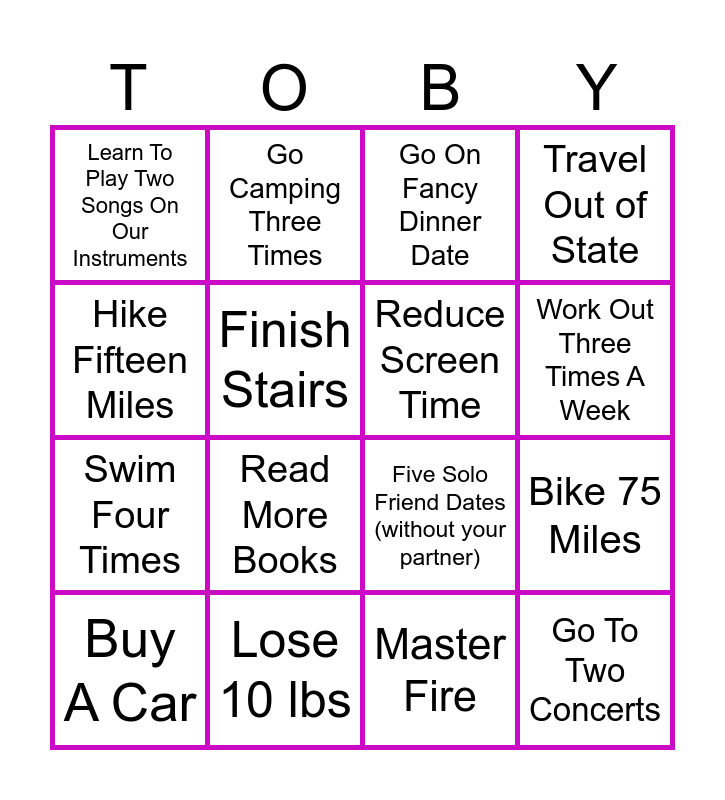This bingo card has 16 words: Lose 10 lbs, Bike 75 Miles, Go On Fancy Dinner Date, Learn To Play Two Songs On Our Instruments, Swim Four Times, Go Camping Three Times, Five Solo Friend Dates (without your partner), Master Fire, Hike Fifteen Miles, Finish Stairs, Buy A Car, Travel Out of State, Read More Books, Work Out Three Times A Week, Reduce Screen Time and Go To Two Concerts.