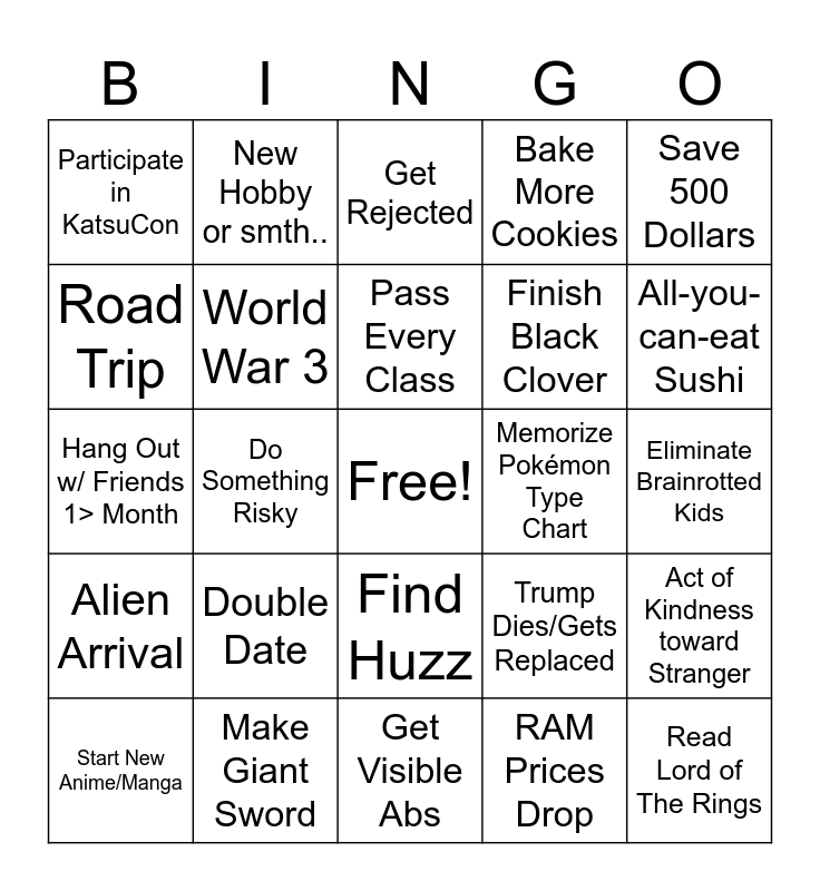 This bingo card has a free space and 24 words: Double Date, Make Giant Sword, Pass Every Class, Start New Anime/Manga, Save 500 Dollars, Participate in KatsuCon, Road Trip, New Hobby or smth.., Memorize Pokémon Type Chart, Find Huzz, Finish Black Clover, Hang Out w/ Friends 1> Month, Trump Dies/Gets Replaced, Act of Kindness toward Stranger, World War 3, RAM Prices Drop, Eliminate Brainrotted Kids, Get Rejected, All-you-can-eat Sushi, Do Something Risky, Read Lord of The Rings, Alien Arrival, Bake More Cookies and Get Visible Abs.