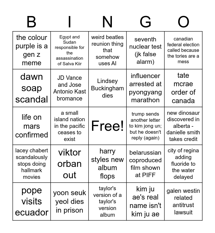 This bingo card has a free space and 24 words: pope visits ecuador, viktor orban out, Lindsey Buckingham dies, kim ju ae's real name isn't kim ju ae, canadian federal election called because the tories are a mess, the colour purple is a gen z meme, Egypt and Sudan responsible for the assassination of Salva Kiir, weird beatles reunion thing that somehow uses AI, trump sends another letter to kim jong un; but he doesn't reply (again), new dinosaur discovered in alberta - danielle smith takes credit, life on mars confirmed, JD Vance and Jose Antonio Kast bromance, belarussian coproduced film shown at PIFF, city of regina adding fluoride to the water delayed, dawn soap scandal, yoon seuk yeol dies in prison, taylor's version of a taylor's version album, seventh nuclear test (jk false alarm), tate mcrae order of canada, lacey chabert scandalously stops doing hallmark movies, a small island nation in the pacific ceases to exist, harry styles new album flops, influencer arrested at pyongyang marathon and galen westin related antitrust lawsuit.