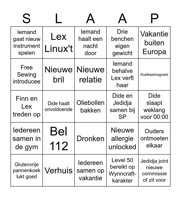This bingo card has a free space and 24 words: Bel 112, Verhuis, Nieuwe relatie, Glutenvrije pannenkoek lukt goed, Vakantie buiten Europa, Iemand gaat nieuw instrument spelen, Free Sewing introducee, Lex Linux't, Dide en Jedidja samen bij SP, Dronken, Iemand behalve Lex verft haar, Finn en Lex treden op, Nieuwe allergie unlocked, Ouders ontmoeten elkaar, Nieuwe bril, Level 50 bereikt op Wynncraft-karakter, Dide slaapt weklang voor 00:00, Iemand haalt een nacht door, Koelkastmagneet, Dide haalt onvoldoende, Jedidja joint nieuwe commissie of zit voor, Iedereen samen in de gym, Drie benchen eigen gewicht and Iedereen samen op vakantie.