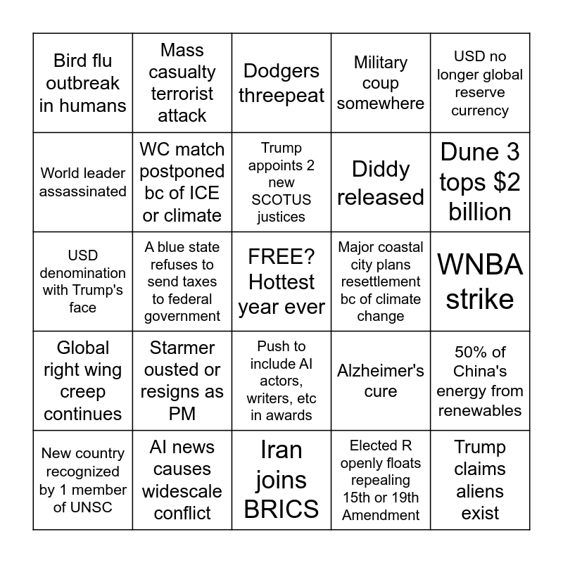 This bingo card has a free space and 24 words: Starmer ousted or resigns as PM, AI news causes widescale conflict, Trump appoints 2 new SCOTUS justices, New country recognized by 1 member of UNSC, USD no longer global reserve currency, Bird flu outbreak in humans, World leader assassinated, Mass casualty terrorist attack, Major coastal city plans resettlement bc of climate change, Push to include AI actors, writers, etc in awards, Diddy released, USD denomination with Trump's face, Alzheimer's cure, 50% of China's energy from renewables, WC match postponed bc of ICE or climate, Elected R openly floats repealing 15th or 19th Amendment, WNBA strike, Dodgers threepeat, Dune 3 tops $2 billion, A blue state refuses to send taxes to federal government, Trump claims aliens exist, Global right wing creep continues, Military coup somewhere and Iran joins BRICS.