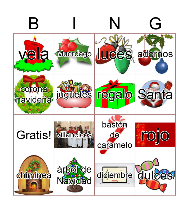 This bingo card has 24 images and 25 words: Navidad, estrella, bastón de caramelo, elfo, vela, Muerdago, luces, adornos, Gratis!, villancicos, diciembre, rojo, renos, árbol de Navidad, regalo, tarjetas, chiminea, juguetes, verde, dulces, corona navideña, mono de nieve, pan de jengibre, Santa and calcetín navideña.
