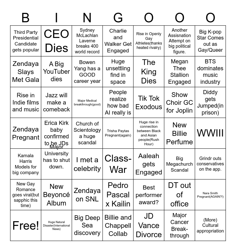 This bingo card has 49 words: DT out of office, Megan Thee Stallion Engaged, JD Vance Divorce, Erica Kirk baby confirmed to be JDs, Major Medical breakthrough(good), WWIII, CEO Dies, Big Deep Sea discovery, Another Assisnation Attempt on big political figure., Class-War, Big K-pop Star Comes out as Gay/Queer, Charlie and Walker Get Engaged, Show Choir GC for Joplin, Tik Tok Exodous, New Beyoncé Album, New Billie Perfume, Zendaya Slays Met Gala, BTS dominates music industry, Nara Smith Pregnant(AGAIN?!), Rise in Openly Gay Athletes(thanks heated rivalry), The King Dies, Church of Scientology a huge scandal, Third Party Presidential Candidate gets popular, A Big YouTuber dies, Free!, Bowen Yang has a GOOD career year, Diddy gets Jumped(in prison), Huge Natural Disaster(International News), People realize how bad AI really is, Jazz will make a comeback, (More) Cultural appropriation, Huge rise in connection between Black and Asian people(Rush Hour), New Gay Romance goes viral(but sapphic this time), Zendaya on SNL, Zendaya Pregnant, Aaleah gets Engaged, Big Megachurch Scandal, Grindr outs conservatives on the app., Rise in Indie films and music, I met a celebrity, Pedro Pascal x Kailin, Kamala Harris Models for big company, Trisha Paytas Pregnant(again), Billie and Chappell Collab, Huge unsettling find in space, Sydney McLachlan Laverne breaks 400 world record, Best performer award?, Major University has to shut down. and Major Cancer Break-through.