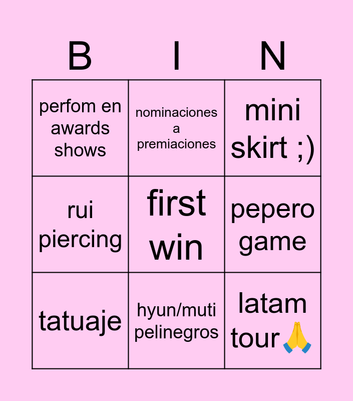 This bingo card has a free space and 8 words: pepero game, mini skirt ;), nominaciones a premiaciones, tatuaje, perfom en awards shows, latam tour🙏, rui piercing and hyun/muti pelinegros.