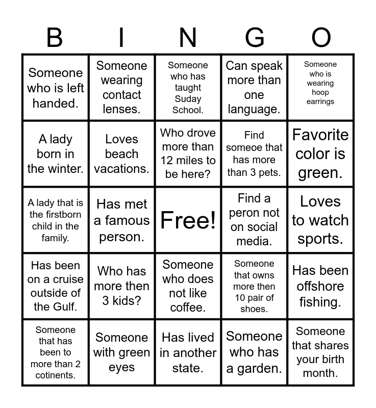 This bingo card has a free space and 24 words: Who has more then 3 kids?, Someone with green eyes, Who drove more than 12 miles to be here?, Someone that has been to more than 2 cotinents., Someone who is wearing hoop earrings, Someone who is left handed., A lady born in the winter., Someone wearing contact lenses., Find a peron not on social media., Someone who does not like coffee., Find someoe that has more than 3 pets., A lady that is the firstborn child in the family., Someone that owns more then 10 pair of shoes., Has been offshore fishing., Loves beach vacations., Someone who has a garden., Loves to watch sports., Someone who has taught Suday School., Favorite color is green., Has met a famous person., Someone that shares your birth month., Has been on a cruise outside of the Gulf., Can speak more than one language. and Has lived in another state..