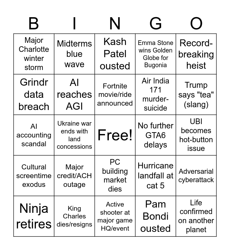 This bingo card has a free space and 24 words: Major credit/ACH outage, King Charles dies/resigns, Fortnite movie/ride announced, Ninja retires, Record-breaking heist, Major Charlotte winter storm, Grindr data breach, Midterms blue wave, No further GTA6 delays, PC building market dies, Air India 171 murder-suicide, AI accounting scandal, Hurricane landfall at cat 5, Adversarial cyberattack, AI reaches AGI, Pam Bondi ousted, UBI becomes hot-button issue, Kash Patel ousted, Trump says "tea" (slang), Ukraine war ends with land concessions, Life confirmed on another planet, Cultural screentime exodus, Emma Stone wins Golden Globe for Bugonia and Active shooter at major game HQ/event.