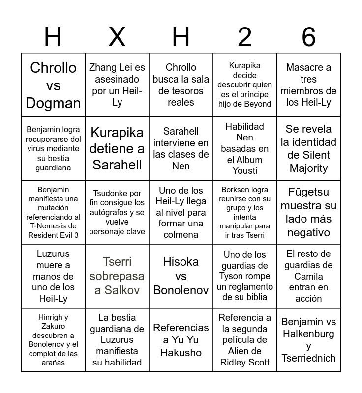This bingo card has a free space and 24 words: Tserri sobrepasa a Salkov, La bestia guardiana de Luzurus manifiesta su habilidad, Sarahell interviene en las clases de Nen, Hinrigh y Zakuro descubren a Bonolenov y el complot de las arañas, Masacre a tres miembros de los Heil-Ly, Chrollo vs Dogman, Benjamin logra recuperarse del virus mediante su bestia guardiana, Zhang Lei es asesinado por un Heil-Ly, Borksen logra reunirse con su grupo y los intenta manipular para ir tras Tserri, Hisoka vs Bonolenov, Habilidad Nen basadas en el Album Yousti, Benjamin manifiesta una mutación referenciando al T-Nemesis de Resident Evil 3, Uno de los guardias de Tyson rompe un reglamento de su biblia, El resto de guardias de Camila entran en acción, Kurapika detiene a Sarahell, Referencia a la segunda película de Alien de Ridley Scott, Fūgetsu muestra su lado más negativo, Chrollo busca la sala de tesoros reales, Se revela la identidad de Silent Majority, Tsudonke por fin consigue los autógrafos y se vuelve personaje clave, Benjamin vs Halkenburg y Tserriednich, Luzurus muere a manos de uno de los Heil-Ly, Kurapika decide descubrir quien es el príncipe hijo de Beyond and Referencias a Yu Yu Hakusho.