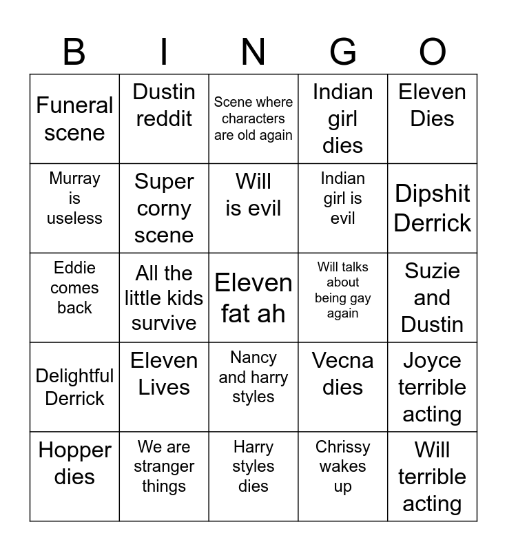 This bingo card has a free space and 24 words: Eleven Lives, We are stranger things, Will is evil, Hopper dies, Eleven Dies, Funeral scene, Murray is useless, Dustin reddit, Will talks about being gay again, Nancy and harry styles, Indian girl is evil, Eddie comes back, Vecna dies, Joyce terrible acting, Super corny scene, Chrissy wakes up, Suzie and Dustin, Scene where characters are old again, Dipshit Derrick, All the little kids survive, Will terrible acting, Delightful Derrick, Indian girl dies and Harry styles dies.