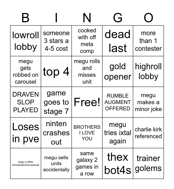 This bingo card has a free space and 24 words: ninten crashes out, megu sells units accidentally, megu rolls and misses unit, megu is either homophobic/homosexual, more than 1 contester, lowroll lobby, megu gets robbed on carousel, someone 3 stars a 4-5 cost, RUMBLE AUGMENT OFFERED, BROTHERS I LOVE YOU, gold opener, DRAVEN SLOP PLAYED, megu tries ixtal again, charlie kirk referenced, top 4, thex bot4s, megu makes a minor joke, cooked with off meta comp, highroll lobby, game goes to stage 7, trainer golems, Loses in pve, dead last and same galaxy 2 games in a row.