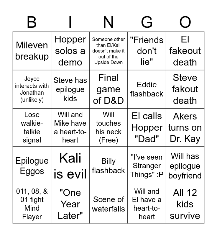 This bingo card has a free space and 24 words: Kali is evil, "One Year Later", Final game of D&D, 011, 08, & 01 fight Mind Flayer, El fakeout death, Mileven breakup, Joyce interacts with Jonathan (unlikely), Hopper solos a demo, El calls Hopper "Dad", Billy flashback, Eddie flashback, Lose walkie-talkie signal, "I've seen Stranger Things" :P, Will has epilogue boyfriend, Steve has epilogue kids, Will and El have a heart-to-heart, Akers turns on Dr. Kay, Someone other than El/Kali doesn't make it out of the Upside Down, Steve fakout death, Will and Mike have a heart-to-heart, All 12 kids survive, Epilogue Eggos, "Friends don't lie" and Scene of waterfalls.