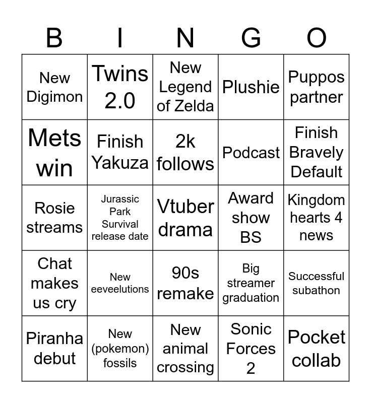 This bingo card has a free space and 24 words: New eeveelutions, New (pokemon) fossils, 2k follows, Piranha debut, Puppos partner, New Digimon, Mets win, Twins 2.0, Award show BS, 90s remake, Podcast, Rosie streams, Big streamer graduation, Successful subathon, Finish Yakuza, Sonic Forces 2, Kingdom hearts 4 news, New Legend of Zelda, Finish Bravely Default, Jurassic Park Survival release date, Pocket collab, Chat makes us cry, Plushie and New animal crossing.