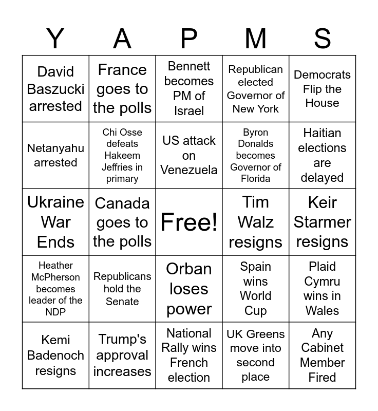 This bingo card has a free space and 24 words: Republicans hold the Senate, Trump's approval increases, US attack on Venezuela, Kemi Badenoch resigns, Democrats Flip the House, David Baszucki arrested, Netanyahu arrested, France goes to the polls, Tim Walz resigns, Orban loses power, Byron Donalds becomes Governor of Florida, Ukraine War Ends, Spain wins World Cup, Plaid Cymru wins in Wales, Chi Osse defeats Hakeem Jeffries in primary, UK Greens move into second place, Keir Starmer resigns, Bennett becomes PM of Israel, Haitian elections are delayed, Canada goes to the polls, Any Cabinet Member Fired, Heather McPherson becomes leader of the NDP, Republican elected Governor of New York and National Rally wins French election.