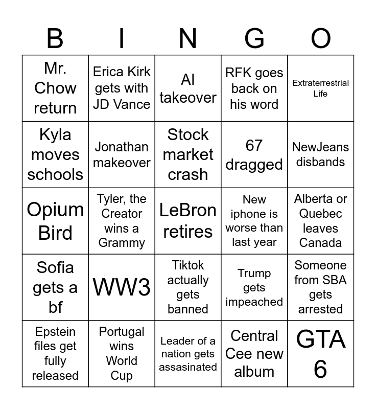 This bingo card has a free space and 24 words: WW3, Portugal wins World Cup, Stock market crash, Epstein files get fully released, Extraterrestrial Life, Mr. Chow return, Kyla moves schools, Erica Kirk gets with JD Vance, New iphone is worse than last year, Tiktok actually gets banned, 67 dragged, Opium Bird, Trump gets impeached, Someone from SBA gets arrested, Jonathan makeover, Central Cee new album, Alberta or Quebec leaves Canada, AI takeover, NewJeans disbands, Tyler, the Creator wins a Grammy, GTA 6, Sofia gets a bf, RFK goes back on his word and Leader of a nation gets assasinated.