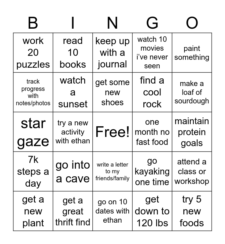 This bingo card has a free space and 24 words: get a new plant, go into a cave, get some new shoes, get down to 120 lbs, paint something, work 20 puzzles, read 10 books, keep up with a journal, one month no fast food, maintain protein goals, star gaze, watch a sunset, go kayaking one time, attend a class or workshop, track progress with notes/photos, get a great thrift find, go on 10 dates with ethan, watch 10 movies i’ve never seen, make a loaf of sourdough, 7k steps a day, try a new activity with ethan, write a letter to my friends/family, find a cool rock and try 5 new foods.
