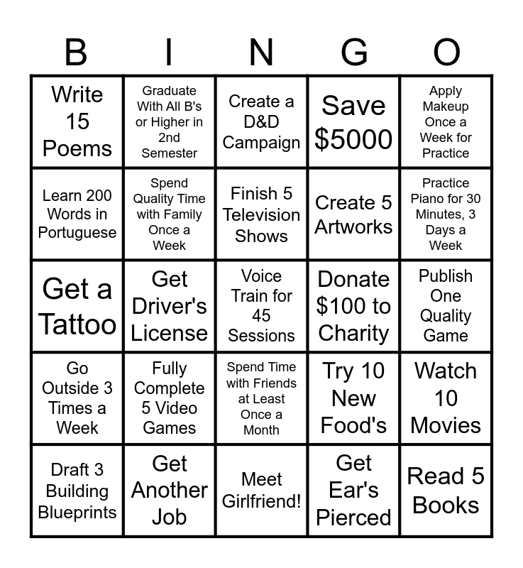 This bingo card has 25 words: Go Outside 3 Times a Week, Get Another Job, Voice Train for 45 Sessions, Get Ear's Pierced, Apply Makeup Once a Week for Practice, Write 15 Poems, Graduate With All B's or Higher in 2nd Semester, Create a D&D Campaign, Donate $100 to Charity, Watch 10 Movies, Learn 200 Words in Portuguese, Spend Quality Time with Family Once a Week, Meet Girlfriend!, Try 10 New Food's, Practice Piano for 30 Minutes, 3 Days a Week, Draft 3 Building Blueprints, Get Driver's License, Finish 5 Television Shows, Create 5 Artworks, Publish One Quality Game, Get a Tattoo, Fully Complete 5 Video Games, Spend Time with Friends at Least Once a Month, Save $5000 and Read 5 Books.