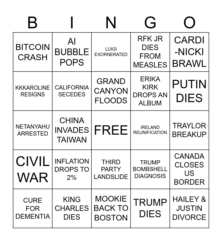 This bingo card has a free space and 25 words: INFLATION DROPS TO 2%, MOOKIE BACK TO BOSTON, GRAND CANYON FLOODS, CURE FOR DEMENTIA, CARDI -NICKI BRAWL, BITCOIN CRASH, KKKAROLINE RESIGNS, AI BUBBLE POPS, IRELAND REUNIFICATION, THIRD PARTY LANDSLIDE, ERIKA KIRK DROPS AN ALBUM, NETANYAHU ARRESTED, TRUMP BOMBSHELL DIAGNOSIS, CANADA CLOSES US BORDER, CALIFORNIA SECEDES, HEGESTH CHARGED W/ WAR CRIMES, TRAYLOR BREAKUP, LUIGI EXORNERATED, PUTIN DIES, CHINA INVADES TAIWAN, HAILEY & JUSTIN DIVORCE, KING CHARLES DIES, CIVIL WAR, RFK JR DIES FROM MEASLES and TRUMP DIES.