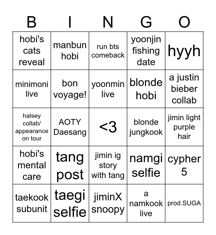 This bingo card has a free space and 24 words: tang post, taegi selfie, yoonmin live, taekook subunit, hyyh, hobi's cats reveal, minimoni live, manbun hobi, blonde jungkook, jimin ig story with tang, blonde hobi, halsey collab/ appearance on tour, namgi selfie, cypher 5, bon voyage!, a namkook live, jimin light purple hair, run bts comeback, a justin bieber collab, AOTY Daesang, prod.SUGA, hobi's mental care, yoonjin fishing date and jiminX snoopy.