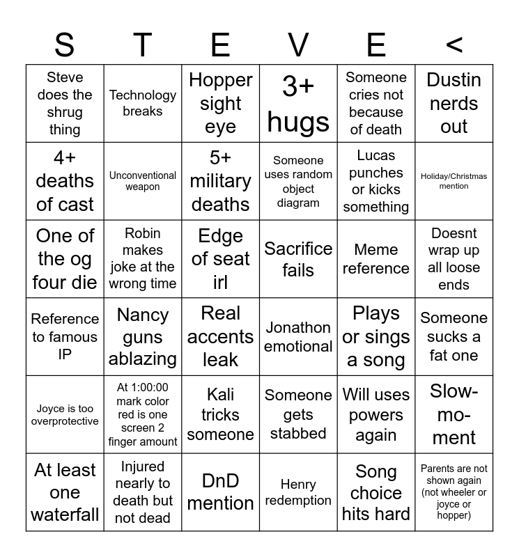 This bingo card has 36 words: Someone gets stabbed, Kali tricks someone, Henry redemption, 4+ deaths of cast, Reference to famous IP, Sacrifice fails, Unconventional weapon, DnD mention, Someone cries not because of death, Will uses powers again, Holiday/Christmas mention, 3+ hugs, Slow-mo-ment, Robin makes joke at the wrong time, Someone uses random object diagram, Steve does the shrug thing, Joyce is too overprotective, Meme reference, One of the og four die, Hopper sight eye, Edge of seat irl, Nancy guns ablazing, Jonathon emotional, Real accents leak, Plays or sings a song, Technology breaks, Lucas punches or kicks something, Injured nearly to death but not dead, 5+ military deaths, Dustin nerds out, Parents are not shown again (not wheeler or joyce or hopper), At least one waterfall, Someone sucks a fat one, Doesnt wrap up all loose ends, At 1:00:00 mark color red is one screen 2 finger amount and Song choice hits hard.