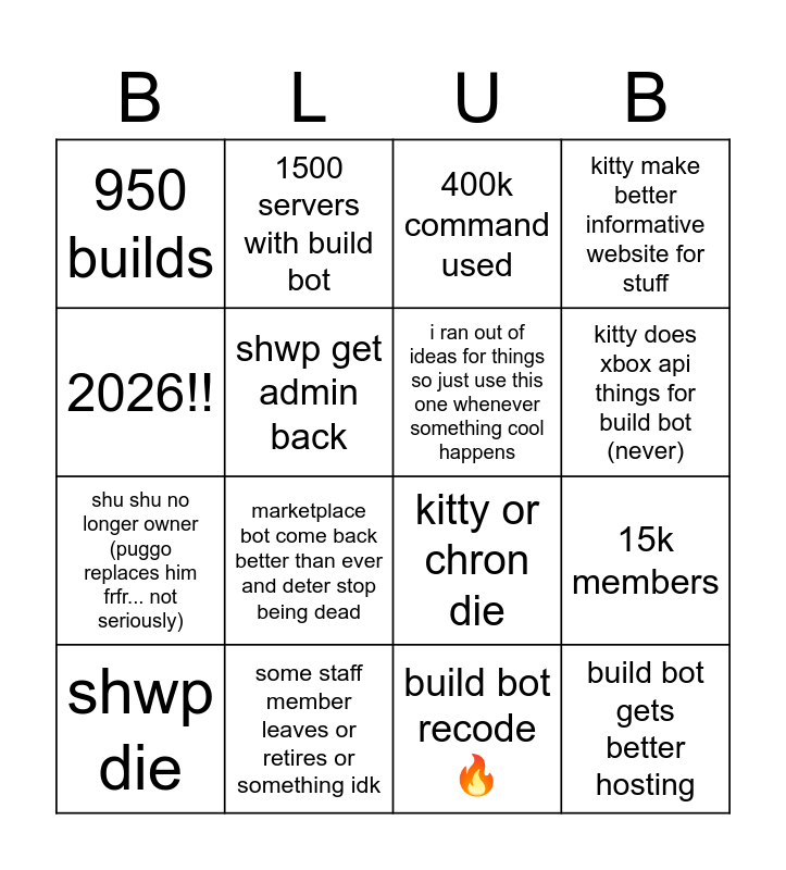 This bingo card has 16 words: some staff member leaves or retires or something idk, 15k members, 400k command used, 950 builds, shu shu no longer owner (puggo replaces him frfr... not seriously), 1500 servers with build bot, kitty or chron die, build bot recode 🔥, 2026!!, shwp get admin back, shwp die, kitty make better informative website for stuff, marketplace bot come back better than ever and deter stop being dead, kitty does xbox api things for build bot (never), i ran out of ideas for things so just use this one whenever something cool happens and build bot gets better hosting.