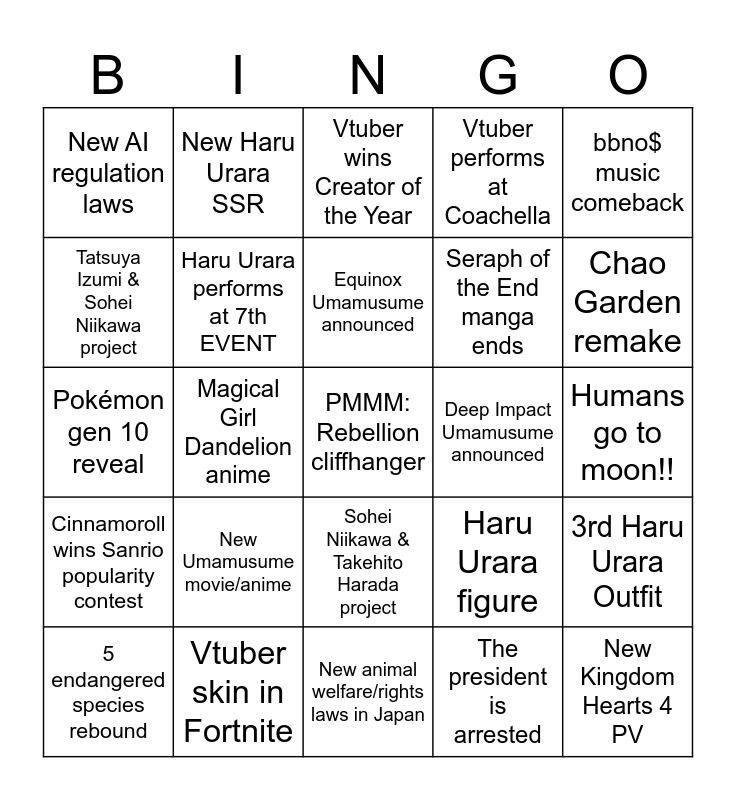 This bingo card has 25 words: New Umamusume movie/anime, New animal welfare/rights laws in Japan, Equinox Umamusume announced, 5 endangered species rebound, bbno$ music comeback, New AI regulation laws, Tatsuya Izumi & Sohei Niikawa project, New Haru Urara SSR, Deep Impact Umamusume announced, Sohei Niikawa & Takehito Harada project, Seraph of the End manga ends, Pokémon gen 10 reveal, Haru Urara figure, 3rd Haru Urara Outfit, Haru Urara performs at 7th EVENT, New Kingdom Hearts 4 PV, Humans go to moon!!, Vtuber wins Creator of the Year, Chao Garden remake, Magical Girl Dandelion anime, PMMM: Rebellion cliffhanger, Vtuber skin in Fortnite, Cinnamoroll wins Sanrio popularity contest, Vtuber performs at Coachella and The president is arrested.