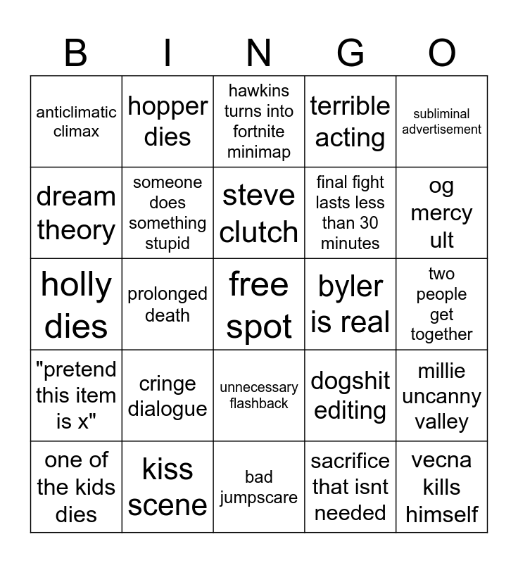 This bingo card has a free space and 24 words: cringe dialogue, kiss scene, steve clutch, one of the kids dies, subliminal advertisement, anticlimatic climax, dream theory, hopper dies, byler is real, unnecessary flashback, final fight lasts less than 30 minutes, holly dies, dogshit editing, millie uncanny valley, someone does something stupid, sacrifice that isnt needed, two people get together, hawkins turns into fortnite minimap, og mercy ult, prolonged death, vecna kills himself, "pretend this item is x", terrible acting and bad jumpscare.