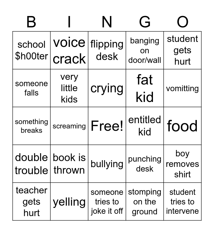 This bingo card has a free space and 24 words: book is thrown, yelling, crying, teacher gets hurt, student gets hurt, school $h00ter, someone falls, voice crack, entitled kid, bullying, fat kid, something breaks, punching desk, boy removes shirt, very little kids, stomping on the ground, food, flipping desk, vomitting, screaming, student tries to intervene, double trouble, banging on door/wall and someone tries to joke it off.