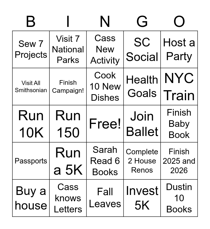 This bingo card has a free space and 24 words: Run a 5K, Cass knows Letters, Cook 10 New Dishes, Buy a house, Host a Party, Sew 7 Projects, Visit All Smithsonian, Visit 7 National Parks, Join Ballet, Sarah Read 6 Books, Health Goals, Run 10K, Complete 2 House Renos, Finish 2025 and 2026, Finish Campaign!, Invest 5K, Finish Baby Book, Cass New Activity, NYC Train, Run 150, Dustin 10 Books, Passports, SC Social and Fall Leaves.