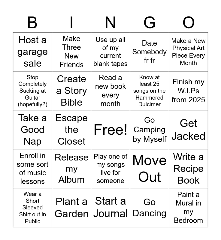 This bingo card has a free space and 24 words: Release my Album, Plant a Garden, Read a new book every month, Wear a Short Sleeved Shirt out in Public, Make a New Physical Art Piece Every Month, Host a garage sale, Stop Completely Sucking at Guitar (hopefully?), Make Three New Friends, Go Camping by Myself, Play one of my songs live for someone, Know at least 25 songs on the Hammered Dulcimer, Take a Good Nap, Move Out, Write a Recipe Book, Create a Story Bible, Go Dancing, Get Jacked, Use up all of my current blank tapes, Finish my W.I.Ps from 2025, Escape the Closet, Paint a Mural in my Bedroom, Enroll in some sort of music lessons, Date Somebody fr fr and Start a Journal.