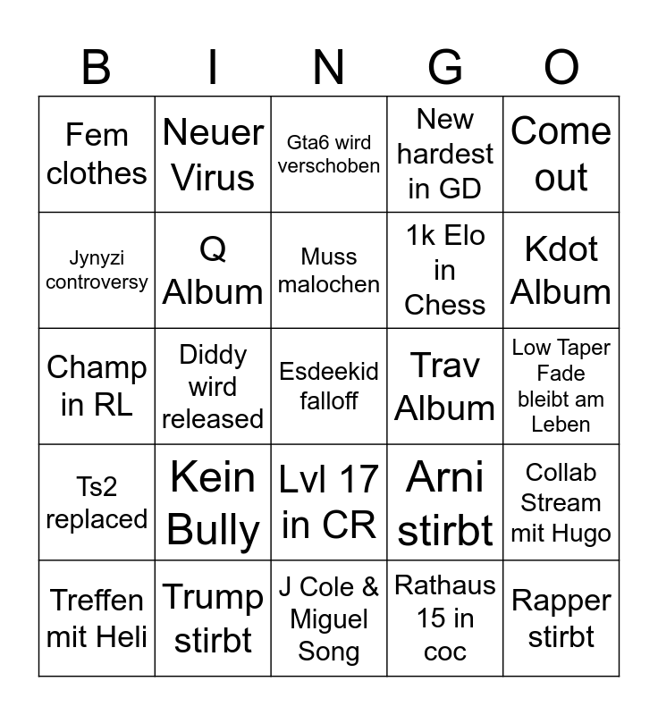 This bingo card has a free space and 24 words: Kein Bully, Trump stirbt, Muss malochen, Treffen mit Heli, Come out, Fem clothes, Jynyzi controversy, Neuer Virus, Trav Album, Lvl 17 in CR, 1k Elo in Chess, Champ in RL, Arni stirbt, Collab Stream mit Hugo, Q Album, Rathaus 15 in coc, Low Taper Fade bleibt am Leben, Gta6 wird verschoben, Kdot Album, Diddy wird released, Rapper stirbt, Ts2 replaced, New hardest in GD and J Cole & Miguel Song.