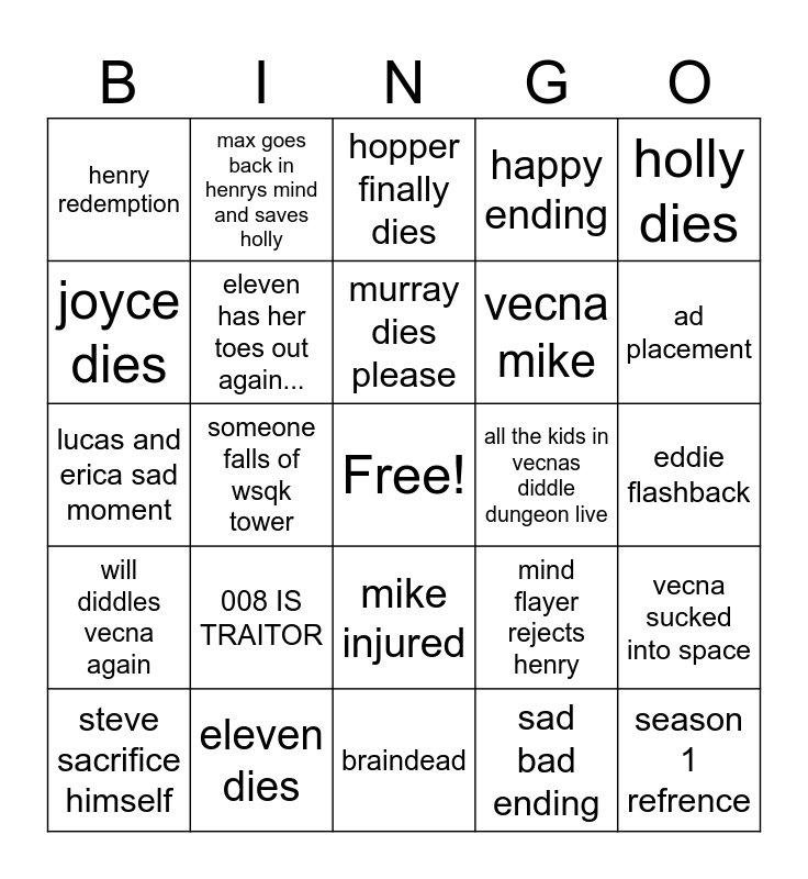This bingo card has a free space and 24 words: 008 IS TRAITOR, eleven dies, murray dies please, steve sacrifice himself, holly dies, henry redemption, joyce dies, max goes back in henrys mind and saves holly, all the kids in vecnas diddle dungeon live, mike injured, vecna mike, lucas and erica sad moment, mind flayer rejects henry, vecna sucked into space, eleven has her toes out again..., sad bad ending, eddie flashback, hopper finally dies, ad placement, someone falls of wsqk tower, season 1 refrence, will diddles vecna again, happy ending and braindead.
