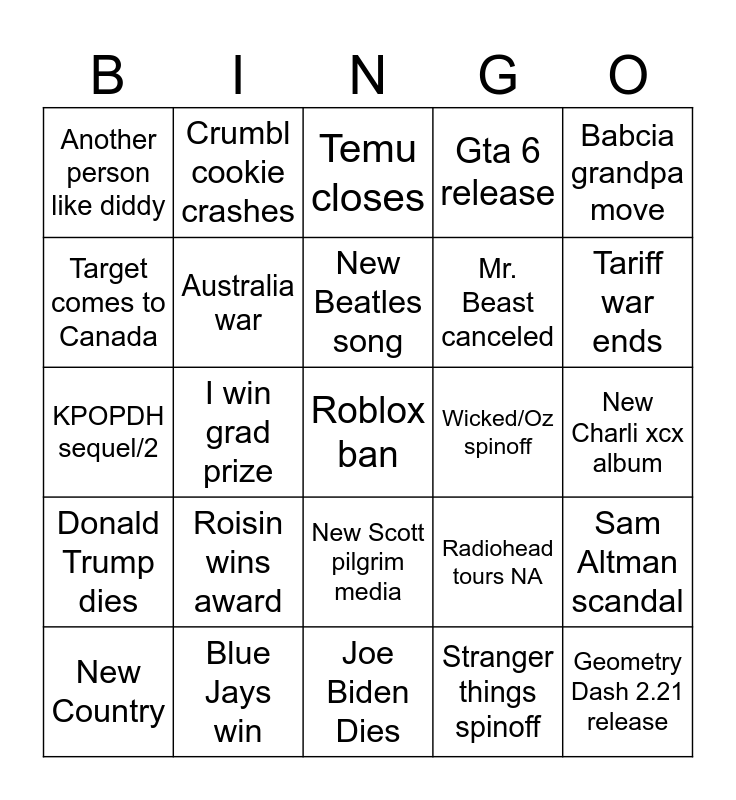 This bingo card has a free space and 24 words: Roisin wins award, Blue Jays win, New Beatles song, New Country, Babcia grandpa move, Another person like diddy, Target comes to Canada, Crumbl cookie crashes, Wicked/Oz spinoff, New Scott pilgrim media, Mr. Beast canceled, KPOPDH sequel/2, Radiohead tours NA, Sam Altman scandal, Australia war, Stranger things spinoff, New Charli xcx album, Temu closes, Tariff war ends, I win grad prize, Geometry Dash 2.21 release, Donald Trump dies, Gta 6 release and Joe Biden Dies.