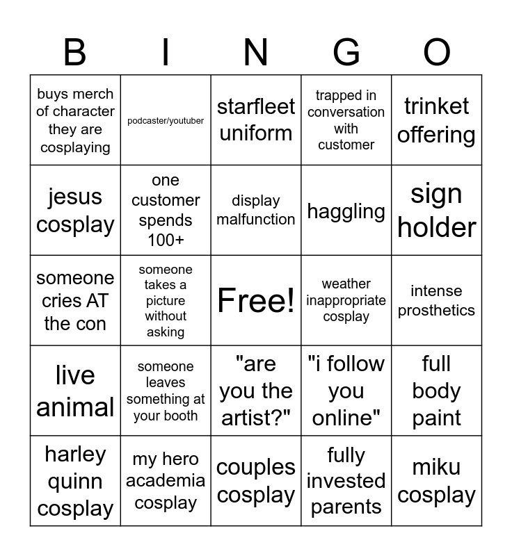 This bingo card has a free space and 36 words: how much is this? *walks away*, unexpected crossover cosplay, kink display, one customer spends 100+, "i follow you online", live animal, display malfunction, food offering, trinket offering, full fursuit, someone takes a picture without asking, trapped in conversation with customer, visibly uncomfortable parent, weather inappropriate cosplay, sign holder, buys merch of character they are cosplaying, steampunk, someone leaves something at your booth, miku cosplay, starfleet uniform, intense prosthetics, full body paint, my hero academia cosplay, harley quinn cosplay, couples cosplay, podcaster/youtuber, someone cries AT the con, someone tries to take something off the display, haggling, jesus cosplay, "i bought this from you last con", cosplay taking up entire aisle, fully invested parents, "are you the artist?", pays 100 for small item and trash left on table.