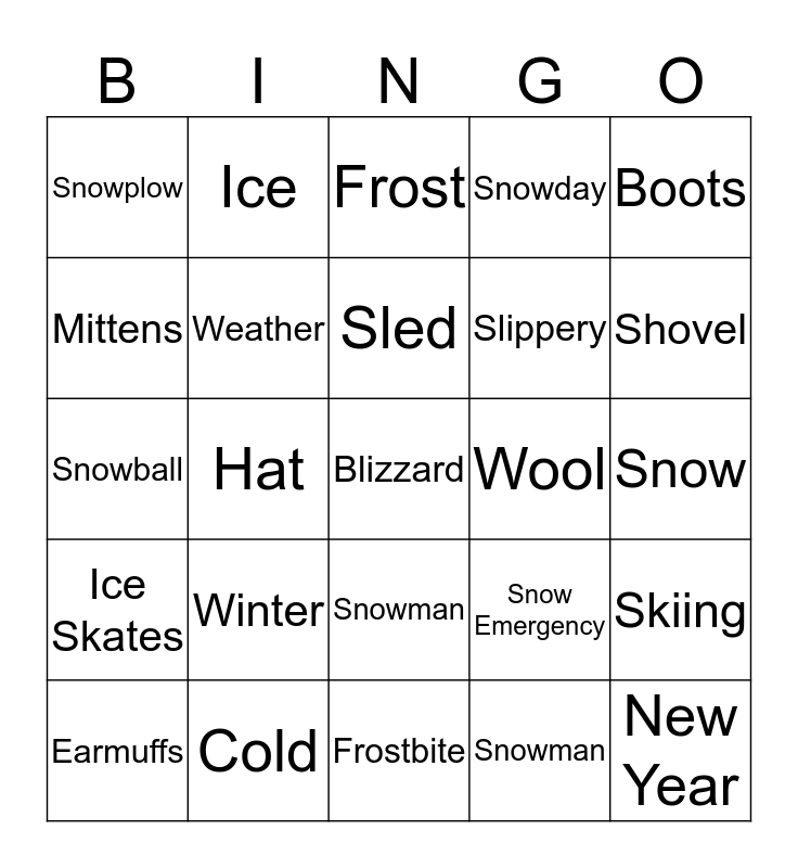 This bingo card has 26 words: Snowman, Snowman, Sled, Cold, Boots, Snowplow, Mittens, Ice, Snow, Snow Emergency, Slippery, Snowball, Skiing, Earmuffs, Hat, Blanket, Snowday, Ice Skates, Frost, Blizzard, Shovel, Frostbite, Wool, Winter, Weather and New Year.