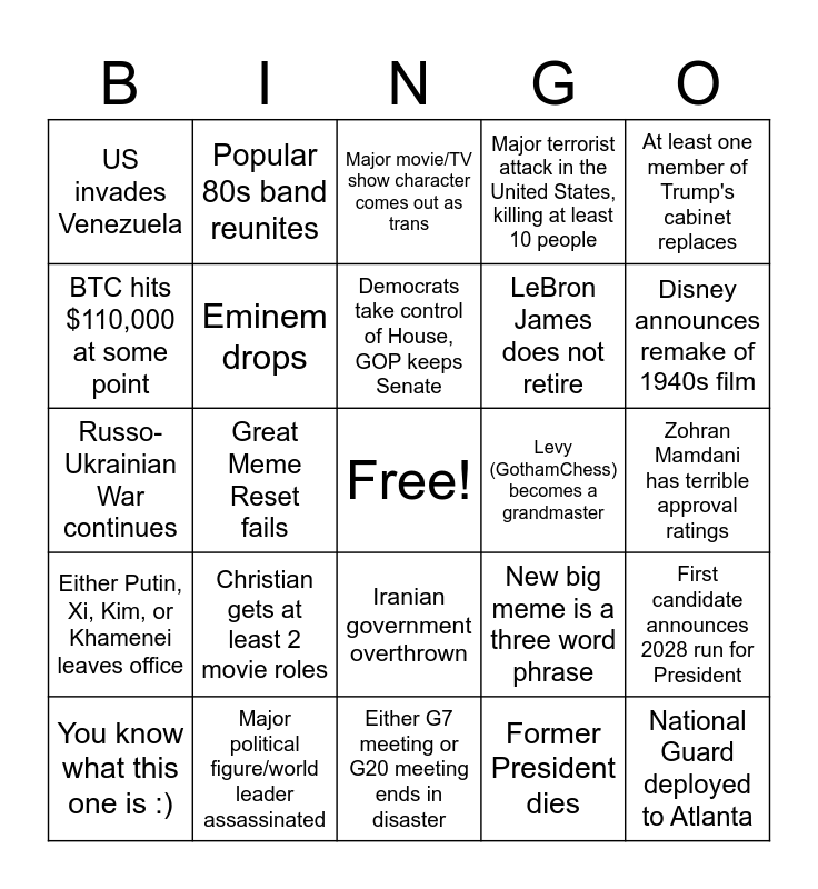 This bingo card has a free space and 24 words: Christian gets at least 2 movie roles, Major political figure/world leader assassinated, Democrats take control of House, GOP keeps Senate, You know what this one is :), At least one member of Trump's cabinet replaces, US invades Venezuela, BTC hits $110,000 at some point, Popular 80s band reunites, Levy (GothamChess) becomes a grandmaster, Iranian government overthrown, LeBron James does not retire, Russo-Ukrainian War continues, New big meme is a three word phrase, First candidate announces 2028 run for President, Eminem drops, Former President dies, Zohran Mamdani has terrible approval ratings, Major movie/TV show character comes out as trans, Disney announces remake of 1940s film, Great Meme Reset fails, National Guard deployed to Atlanta, Either Putin, Xi, Kim, or Khamenei leaves office, Major terrorist attack in the United States, killing at least 10 people and Either G7 meeting or G20 meeting ends in disaster.