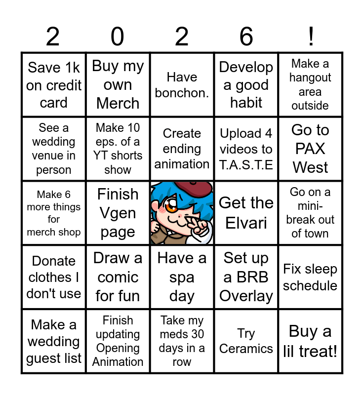 This bingo card has a free space and 24 words: Draw a comic for fun, Finish updating Opening Animation, Create ending animation, Make a wedding guest list, Make a hangout area outside, Save 1k on credit card, See a wedding venue in person, Buy my own Merch, Get the Elvari, Have a spa day, Upload 4 videos to T.A.S.T.E, Make 6 more things for merch shop, Set up a BRB Overlay, Fix sleep schedule, Make 10 eps. of a YT shorts show, Try Ceramics, Go on a mini-break out of town, Have bonchon., Go to PAX West, Finish Vgen page, Buy a lil treat!, Donate clothes I don't use, Develop a good habit and Take my meds 30 days in a row.