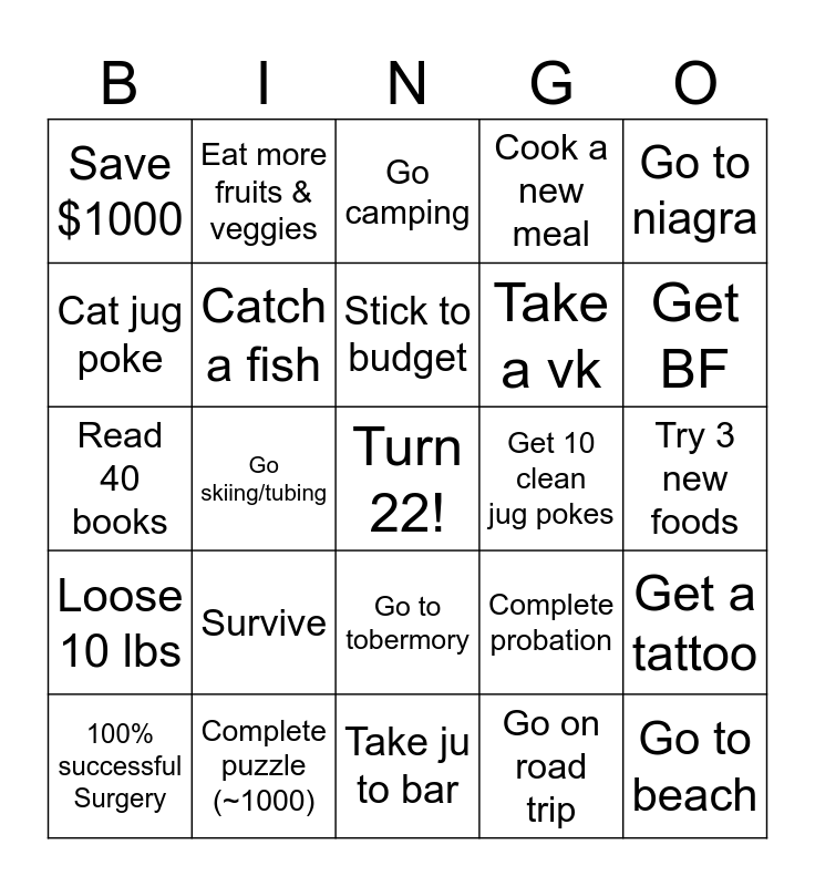 This bingo card has a free space and 24 words: Survive, Complete puzzle (~1000), Stick to budget, 100% successful Surgery, Go to niagra, Save $1000, Cat jug poke, Eat more fruits & veggies, Get 10 clean jug pokes, Go to tobermory, Take a vk, Read 40 books, Complete probation, Get a tattoo, Catch a fish, Go on road trip, Try 3 new foods, Go camping, Get BF, Go skiing/tubing, Go to beach, Loose 10 lbs, Cook a new meal and Take ju to bar.