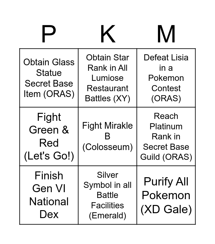 This bingo card has 9 words: Finish Gen VI National Dex, Defeat Lisia in a Pokemon Contest (ORAS), Obtain Star Rank in All Lumiose Restaurant Battles (XY), Fight Green & Red (Let's Go!), Obtain Glass Statue Secret Base Item (ORAS), Reach Platinum Rank in Secret Base Guild (ORAS), Fight Mirakle B (Colosseum), Purify All Pokemon (XD Gale) and Silver Symbol in all Battle Facilities (Emerald).