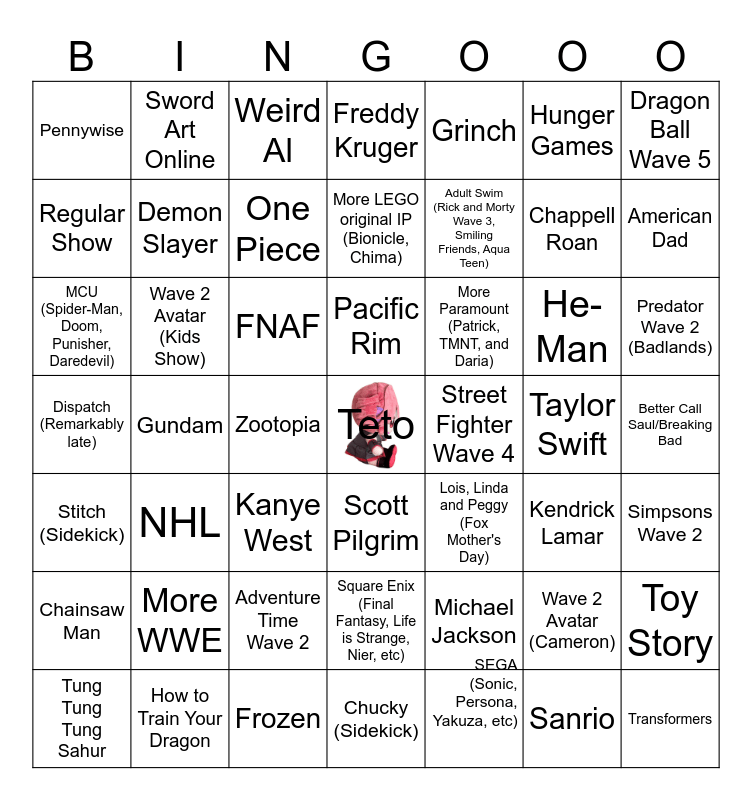 This bingo card has a free space and 48 words: Michael Jackson, Chappell Roan, Chucky (Sidekick), Gundam, FNAF, Better Call Saul/Breaking Bad, Sword Art Online, How to Train Your Dragon, Hunger Games, Scott Pilgrim, Dragon Ball Wave 5, Freddy Kruger, He-Man, More Paramount (Patrick, TMNT, and Daria), Chainsaw Man, Taylor Swift, Regular Show, American Dad, Wave 2 Avatar (Cameron), Grinch, Adult Swim (Rick and Morty Wave 3, Smiling Friends, Aqua Teen), Zootopia, Pennywise, Demon Slayer, Toy Story, One Piece, Predator Wave 2 (Badlands), Tung Tung Tung Sahur, Pacific Rim, Wave 2 Avatar (Kids Show), Sanrio, Street Fighter Wave 4, Simpsons Wave 2, More WWE, Dispatch (Remarkably late), Lois, Linda and Peggy (Fox Mother's Day), Kendrick Lamar, MCU (Spider-Man, Doom, Punisher, Daredevil), Kanye West, Adventure Time Wave 2, Stitch (Sidekick), Transformers, Weird Al, Frozen, More LEGO original IP (Bionicle, Chima), Square Enix (Final Fantasy, Life is Strange, Nier, etc), NHL and SEGA (Sonic, Persona, Yakuza, etc).