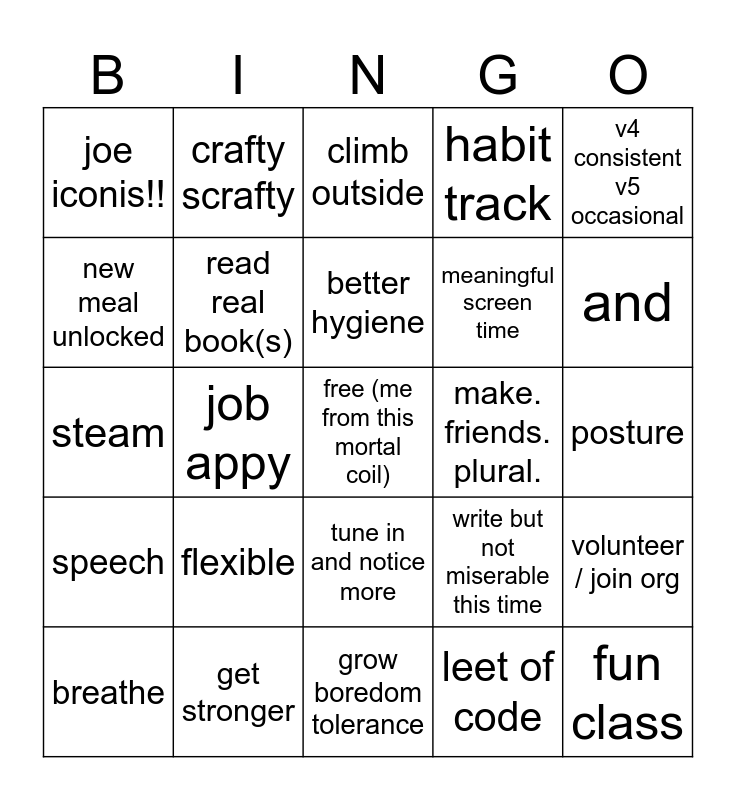 This bingo card has a free space and 24 words: flexible, get stronger, better hygiene, breathe, v4 consistent v5 occasional, joe iconis!!, new meal unlocked, crafty scrafty, make. friends. plural., tune in and notice more, meaningful screen time, steam, write but not miserable this time, volunteer / join org, read real book(s), leet of code, posture, climb outside, and, job appy, fun class, speech, habit track and grow boredom tolerance.