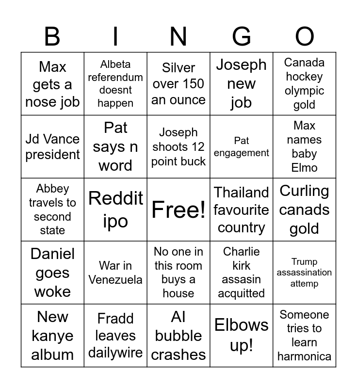 This bingo card has a free space and 24 words: New kanye album, War in Venezuela, Joseph shoots 12 point buck, Elbows up!, Canada hockey olympic gold, Max gets a nose job, Albeta referendum doesnt happen, Silver over 150 an ounce, Thailand favourite country, Curling canads gold, Abbey travels to second state, Pat says n word, Charlie kirk assasin acquitted, Trump assassination attemp, Jd Vance president, Fradd leaves dailywire, AI bubble crashes, Joseph new job, Max names baby Elmo, Daniel goes woke, Reddit ipo, No one in this room buys a house, Pat engagement and Someone tries to learn harmonica.