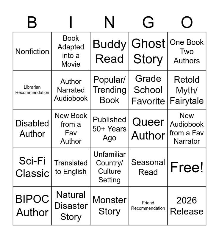 This bingo card has 28 words: Free!, School Required Reading, Grade School Favorite, Friend Recommendation, Librarian Recommendation, Buddy Read, Book Adapted into a Movie, Sci-Fi Classic, Queer Author, BIPOC Author, Disabled Author, Ghost Story, Natural Disaster Story, Monster Story, Retold Myth/ Fairytale, Dystopian Story, Translated to English, Author Narrated Audiobook, Popular/ Trending Book, Unfamiliar Country/ Culture Setting, Nonfiction, 2026 Release, Published 50+ Years Ago, New Book from a Fav Author, New Audiobook from a Fav Narrator, Seasonal Read, One Book Two Authors and Award-Winning Book.