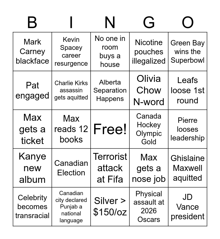 This bingo card has a free space and 24 words: Canadian Election, Canadian city declared Punjab a national language, Alberta Separation Happens, Celebrity becomes transracial, Green Bay wins the Superbowl, Mark Carney blackface, Pat engaged, Kevin Spacey career resurgence, Canada Hockey Olympic Gold, Terrorist attack at Fifa, Olivia Chow N-word, Max gets a ticket, Max gets a nose job, Ghislaine Maxwell aquitted, Charlie Kirks assassin gets aquitted, Physical assault at 2026 Oscars, Pierre looses leadership, No one in room buys a house, Leafs loose 1st round, Max reads 12 books, JD Vance president, Kanye new album, Nicotine pouches illegalized and Silver > $150/oz.