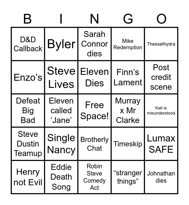 This bingo card has a free space and 24 words: Single Nancy, Eddie Death Song, Eleven Dies, Henry not Evil, Thesselhydra, D&D Callback, Enzo’s, Byler, Murray x Mr Clarke, Brotherly Chat, Finn’s Lament, Defeat Big Bad, Timeskip, Lumax SAFE, Steve Lives, “stranger things”, Kali is misunderstood, Sarah Connor dies, Post credit scene, Eleven called ‘Jane’, Johnathan dies, Steve Dustin Teamup, Mike Redemption and Robin Steve Comedy Act.